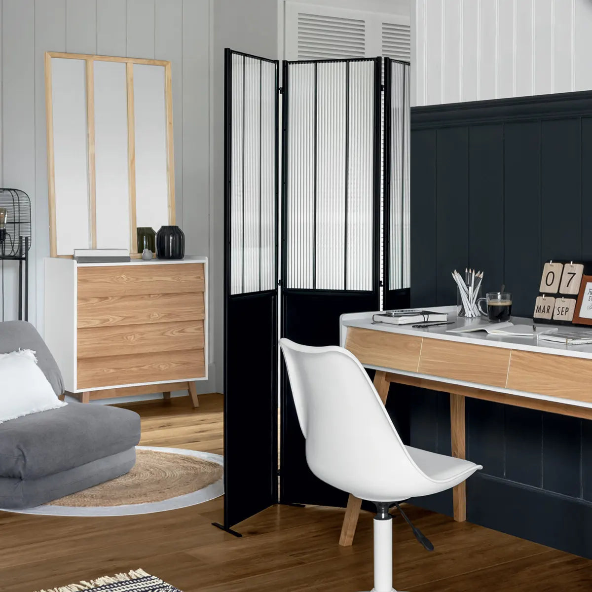 Описание: Този параван съчетава елегантността на стъклото със здравината на стоманената конструкция. Закаленото стъкло осигурява издръжливост и безопасност, а металната рамка гарантира стабилност и дълъг живот на изделието. С модерния си и изчистен дизайн параванът е идеално решение за съвременни интериори, като създава уединение и визуално разделя пространството, без да натоварва обстановката.