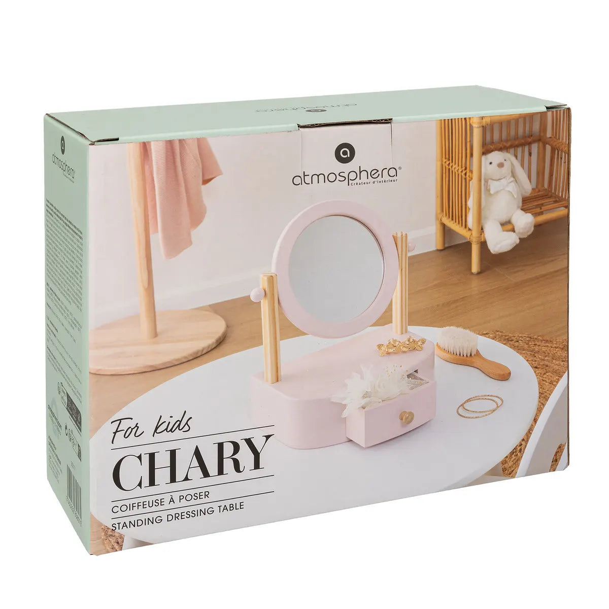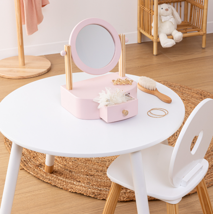 Компактна и лека тоалетка, идеален размер за лесно пренасяне. Вашето дете може да се забавлява, където пожелае. Регулируемо огледало, което може да се настрои спрямо височината на детето. Разполага с 1 чекмедже за съхранение на всички малки принадлежности за красота.