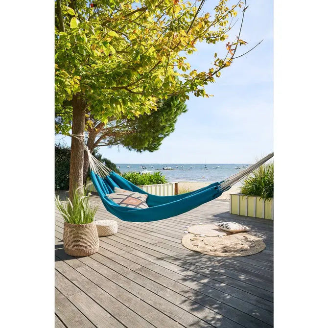 Насладете се на пълен релакс на открито с удобен двоен хамак от Hesperide, създаден за споделени моменти в градината, на терасата, в двора или по време на къмпинг. Просторната лежанка осигурява комфорт за двама и приятна опора за тялото, а стабилната изработка допринася за сигурно и спокойно люлеене.