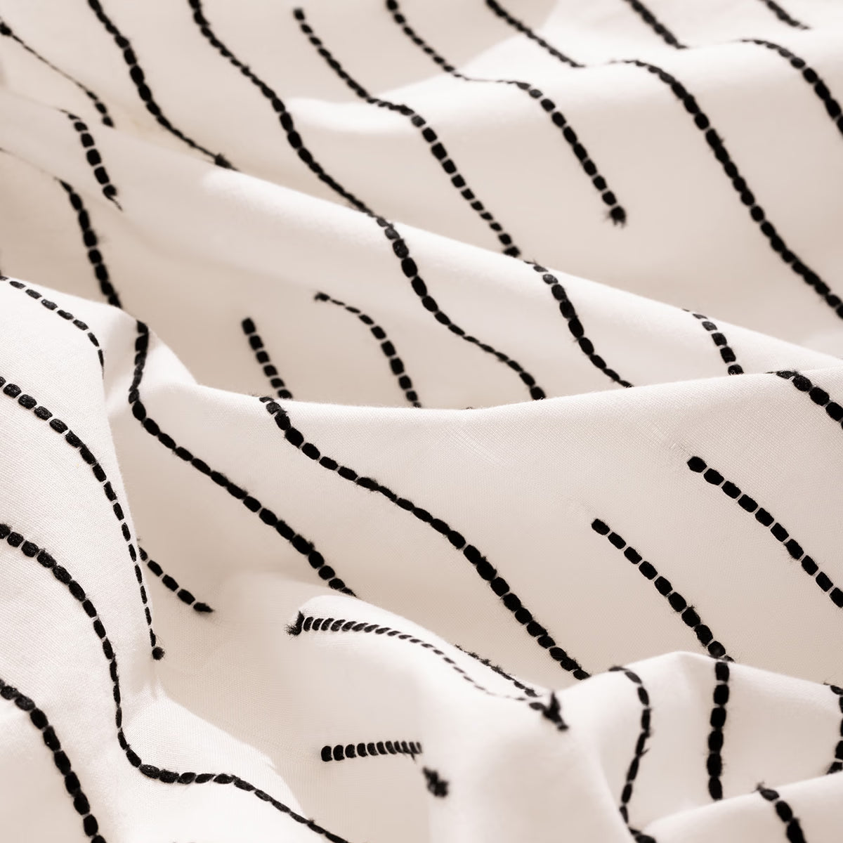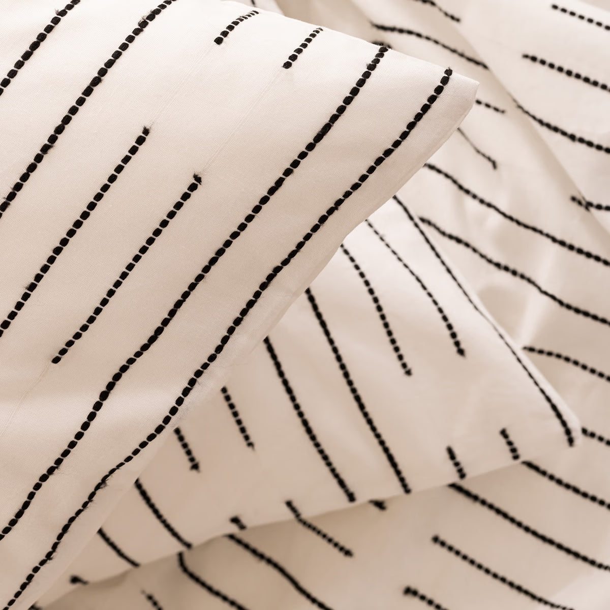 Комплектът включва плик за завивка с практично закопчаване с копчета и две квадратни калъфки за възглавници с размер 65x65 cm. Памукът с ленен ефект е лесен за поддръжка, като запазва своя естествен релеф и стилен вид без нужда от гладене. Материята е устойчива, приятна на допир и създава усещане за уют и топлина през цялата година.