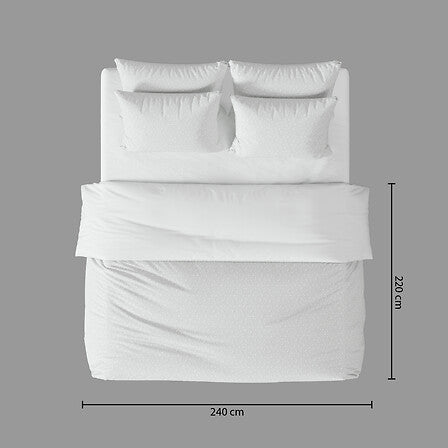 Подарете си елегантност и уют в спалнята с комплекта спално бельо, изработен от висококачествена микрофибърна материя. Предната страна е с фин жакардов релеф в снежнобял цвят, който придава изискан и модерен характер на леглото, докато задната страна от мека микрофибра осигурява комфорт и нежност при допир. Материята е лека, гладка и приятна за кожата, като същевременно е устойчива и лесна за поддръжка.