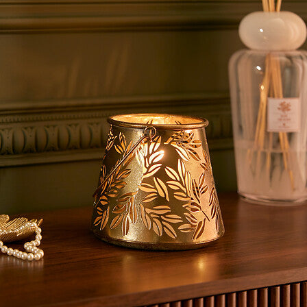Елегантен декоративен фенер с височина 15 см и диаметър 17 см, изработен от метал в златен цвят. Подходящ за свещи и като стилен акцент в интериора или на терасата.