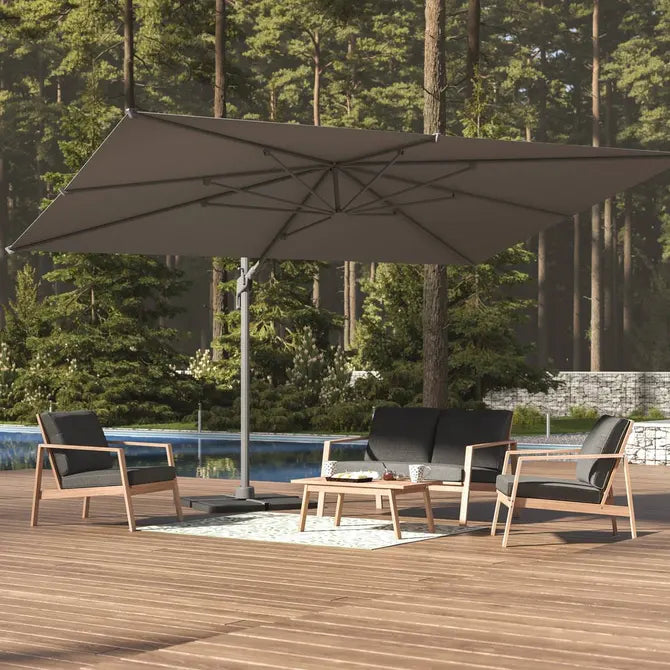 Създайте комфортна сянка и стилна зона за релакс на терасата или в градината с голям градински чадър със странична стойка. Конструкцията с изнесено рамо освобождава пространството под чадъра и улеснява разположението на маса, шезлонги и градински мебели.
