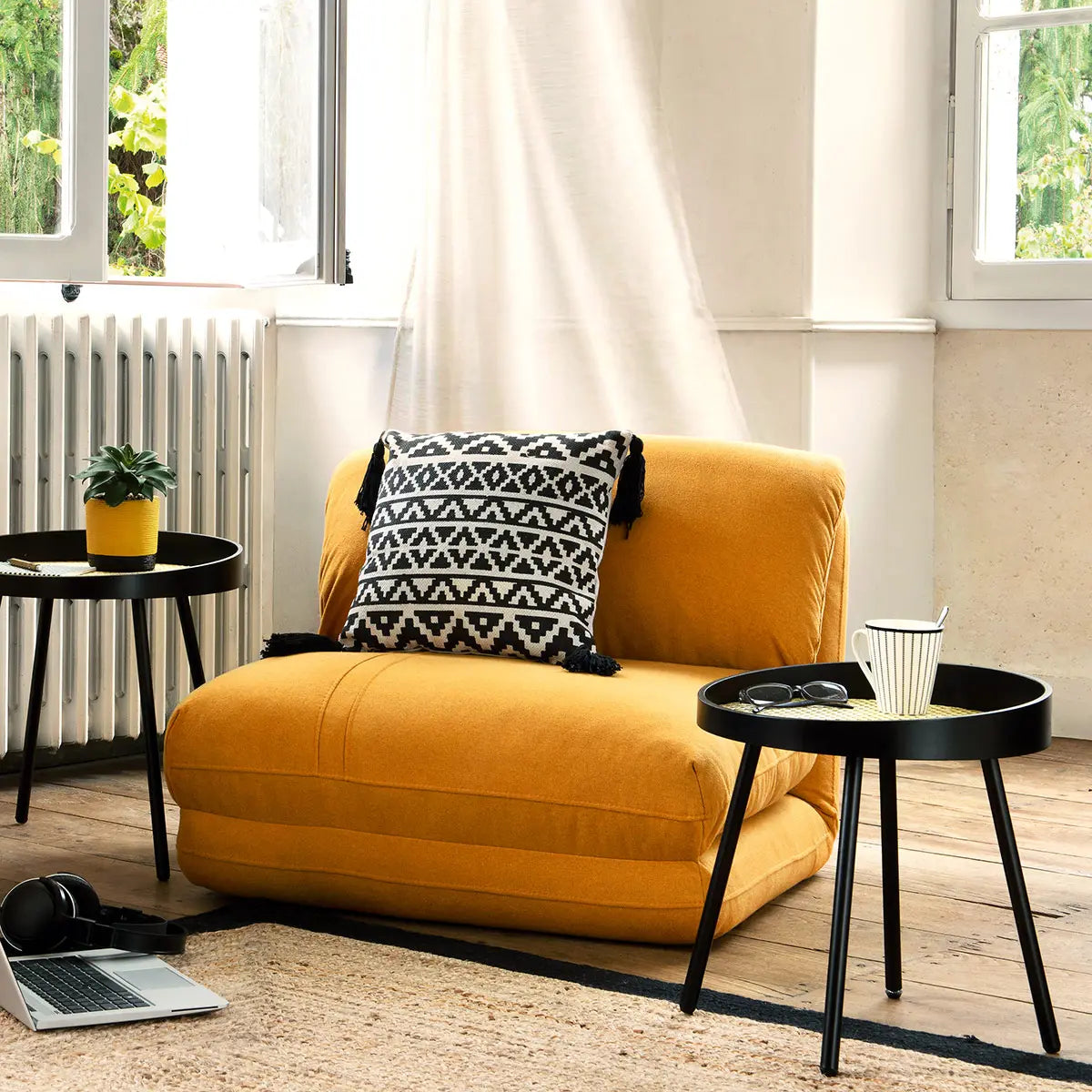 Фотьойл с размери 82 x 58 x 78 см и тегло 11,5 кг, изработен от полиестер, полиуретанова пяна и стомана. Седалката е с височина 29 см, осигуряваща удобна позиция за сядане. Моделът се разгъва в удобно легло с размери 209 x 78 x 10 см – практично решение за гости или малки пространства. Меката тапицерия и стабилната конструкция съчетават комфорт и издръжливост, а изчистеният дизайн позволява лесно съчетаване с различни интериорни стилове.