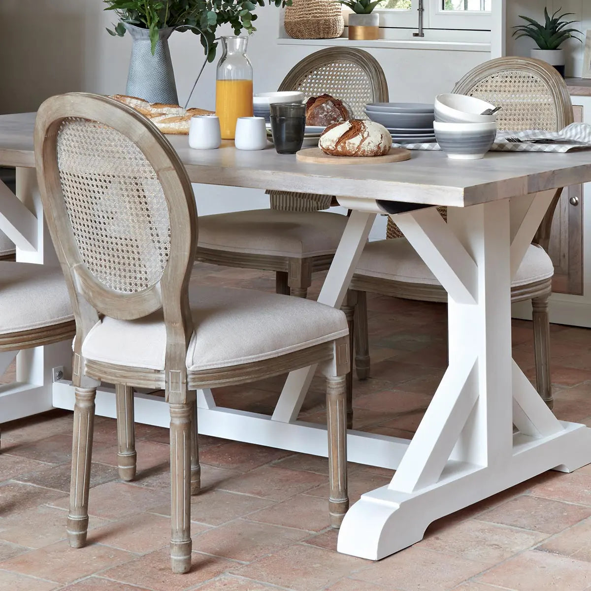Този стол е създаден, за да внесе топлина и гостоприемство. Облегалката от ратан, фините детайли по краката и избеленото дървено покритие създават усещане за лекота и естествена красота. Той seamlessly се вписва както в модерни, така и в по-традиционни интериори.