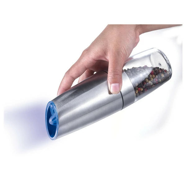 Комплект елегантни, гравитационни електрически мелнички за смилане на черен пипер, сол и други подправки с дизайнерски вид и иновативна форма, която осигурява удобство при употреба. Мелничките са удобни, функционални и лесни за употреба. Удобството при използване е гарантирано от иновативната гравитационна система, която се активира при накланяне на мелничката. Те ще направят така, че свежият аромат на подправките да изпълни дома и да придаде на ястията уникален вкус. Те перфектно ще допълнят оборудването на всяка кухня.