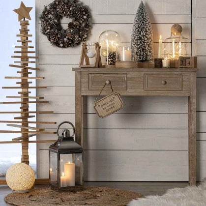 Комбинацията от MDF и масивно дърво осигурява стабилна конструкция с приятно усещане и визуална лекота. Лесна за интегриране в различни стилове мебели, тази конзолна маса предлага баланс между издръжливост и естетика, без да заема много място.