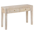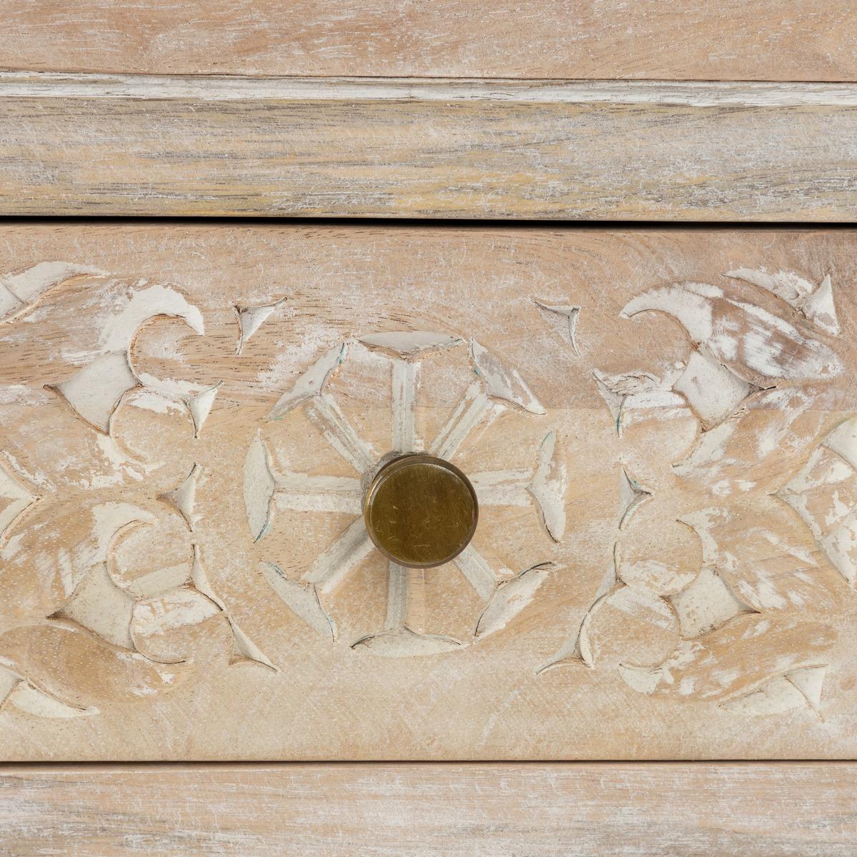 Уникална конзолна маса, изработена от масивно дърво манго с ръчно изработени орнаменти по чекмеджетата. Благодарение на майсторската изработка и ефекта на избелено дърво, всяко изделие е различно и носи неповторим характер.