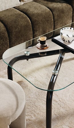 Материал и качество: Стомана и закалено стъкло гарантират дълготрайност, стабилност и лесна поддръжка. Повърхностите са устойчиви на ежедневна употреба, а конструкцията осигурява надеждна опора за аксесоари, книги и декор.