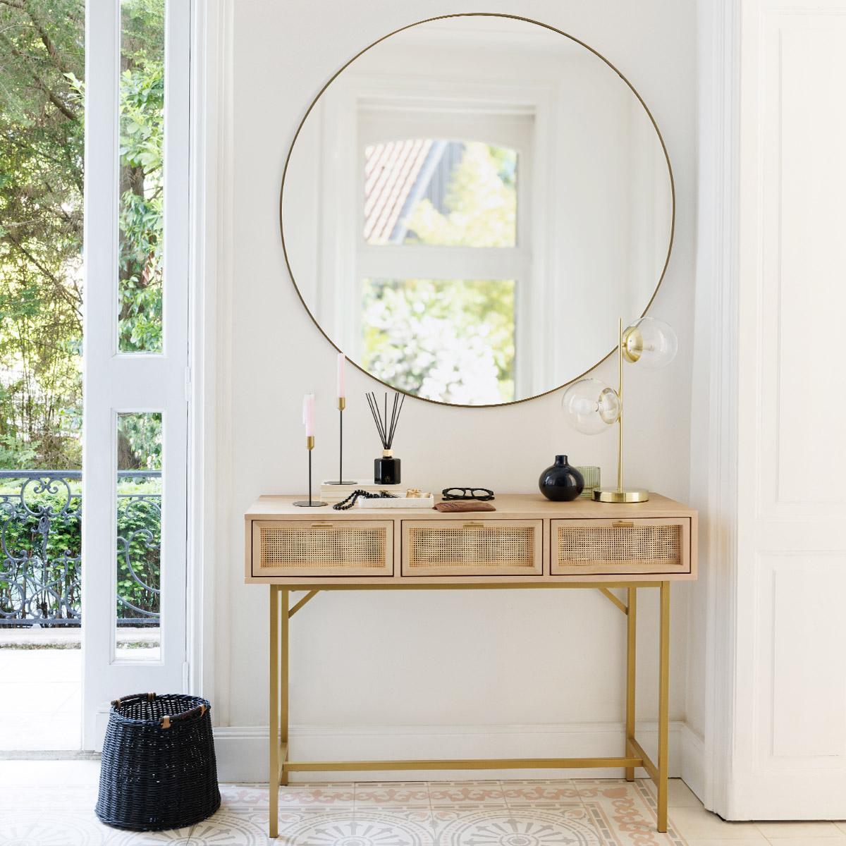 Стилна тоалетка Atmosphera Rayo, която съчетава елегантен дизайн и функционалност. Конструкцията е изработена от метал, бреза и MDF, осигуряващи стабилност и дълготрайност.