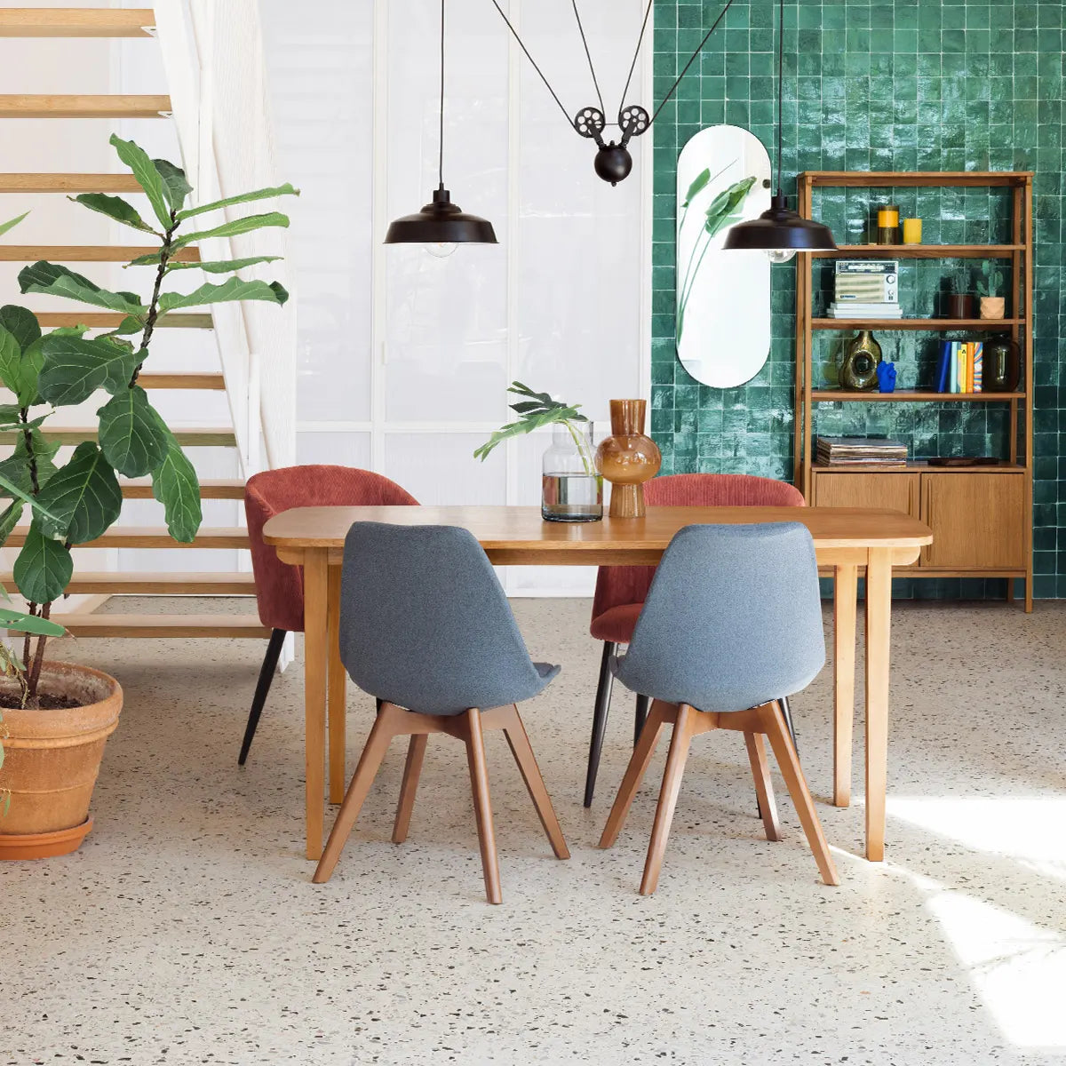 Идеална за до шестима души, масата Oliver е изработена от топла дървесна смес и предлага нежни линии в духа на 50-те години.
