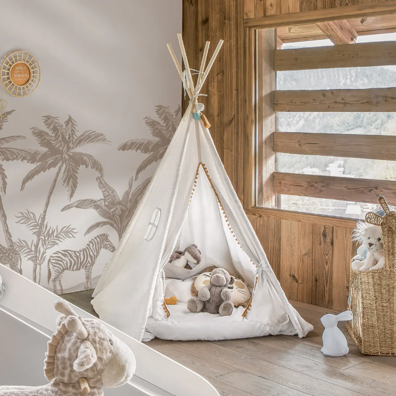 Мека, уютна игрална палатка във формата на типи, създадена за въображаеми приключения и спокойно място за игра или почивка. Дизайнът комбинира стабилна дървена конструкция с издръжливо полиестерно платно, което осигурява комфорт и лесна поддръжка. Идеална за детска стая, градина или като атрактивен елемент в интериора.