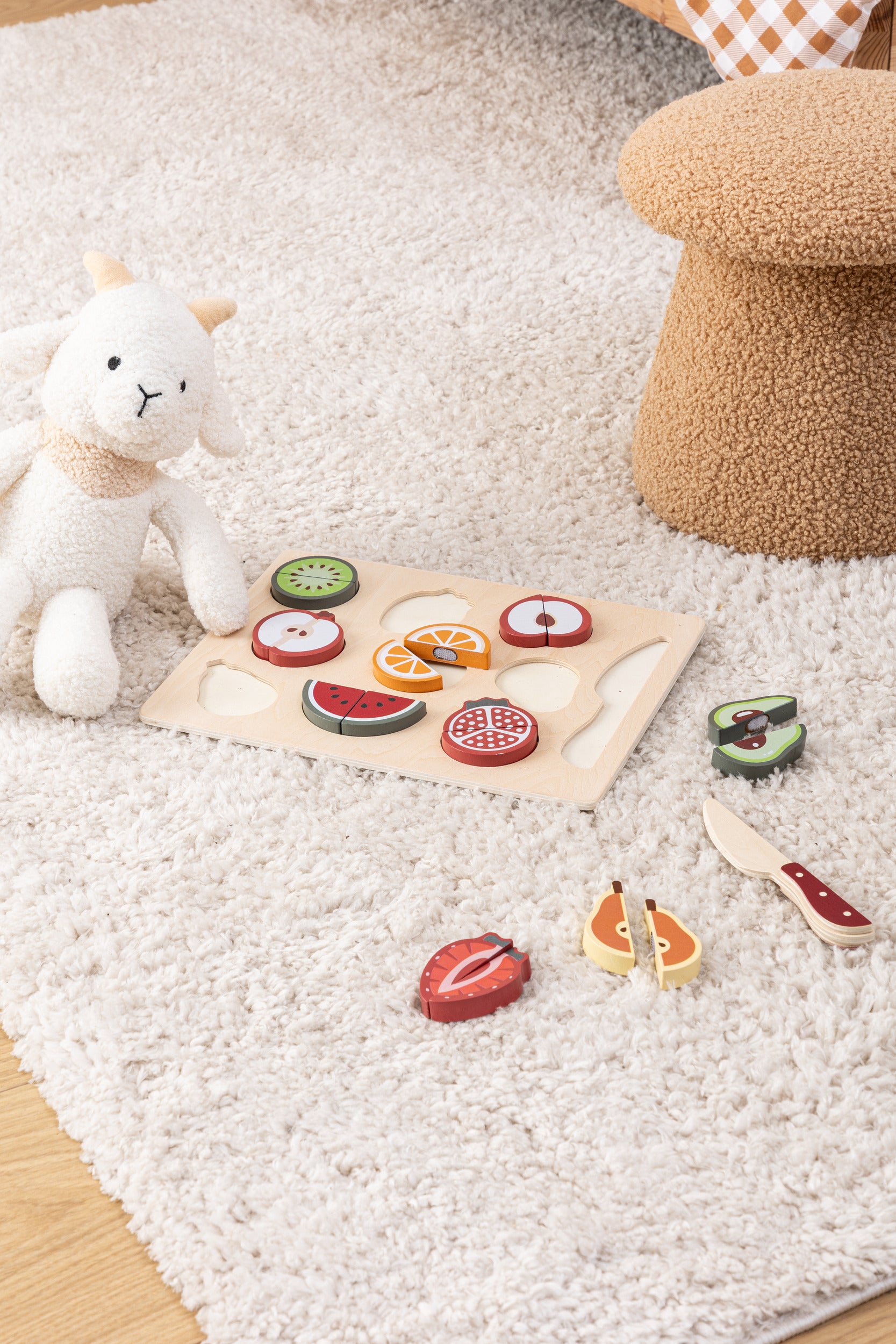 Включва 9 плода (1 киви, 1 ягодa, 1 праскова, 1 ябълка, 1 портокал, 1 авокадо, 1 круша, 1 диня и 1 нар), които могат да се режат с дървено ножче. Подложката за плодовете може да се обърне, за да се използва като дъска за рязане. Играта позволява на децата да имитират родителите си, като същевременно осигурява безопасност. Тя също така помага на децата да разпознават различни плодове. Частите се съединяват помежду си с помощта на велкро. Изработена е с нетоксични бои.