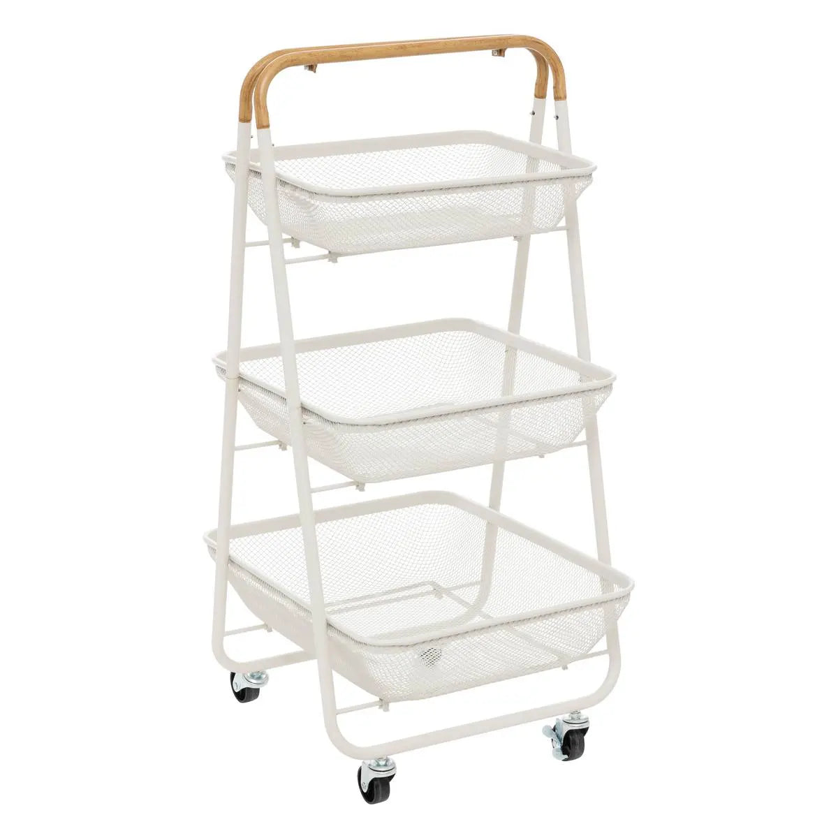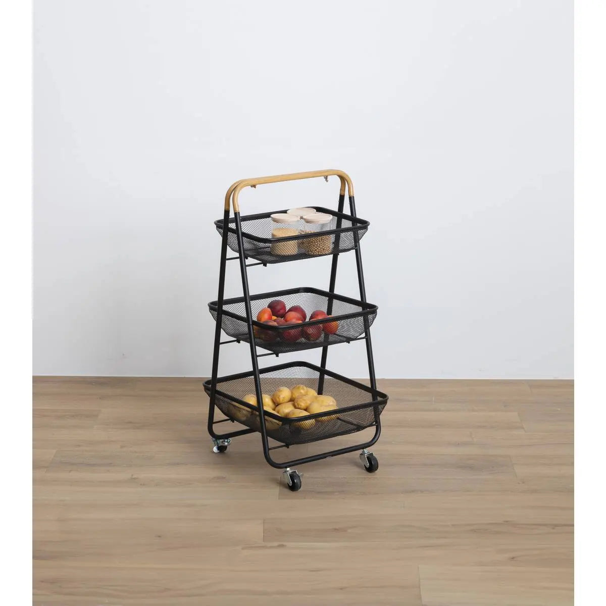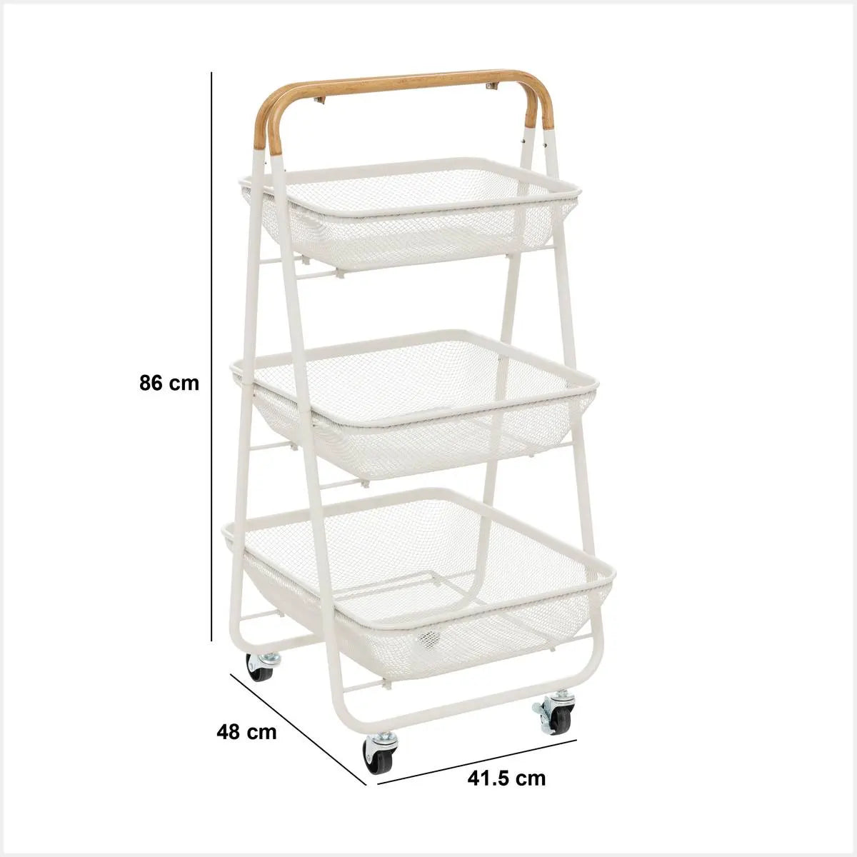 Универсална кухненска количка с изчистен дизайн, съчетаваща здрава метална конструкция и устойчиви дървени рафтове. Тристепенната конфигурация осигурява оптимално кухненско съхранение и бърз достъп до съдове, прибори и продукти, като едновременно придава стил и функционалност на пространството.