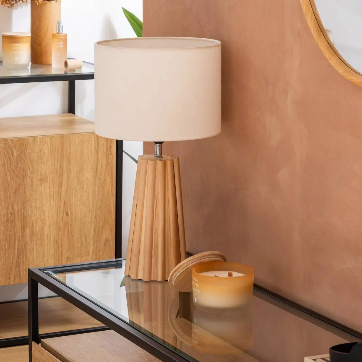 Настолна лампа с размери Ø28 x В53 см, изработена от естествено дърво бор. Топлата текстура и естествените шарки на материала придават уют и хармония, като същевременно добавят стилен акцент към интериора. Подходяща е за спалня, всекидневна или кабинет, където внася природна атмосфера и елегантност. Крушка не е включена в комплекта.