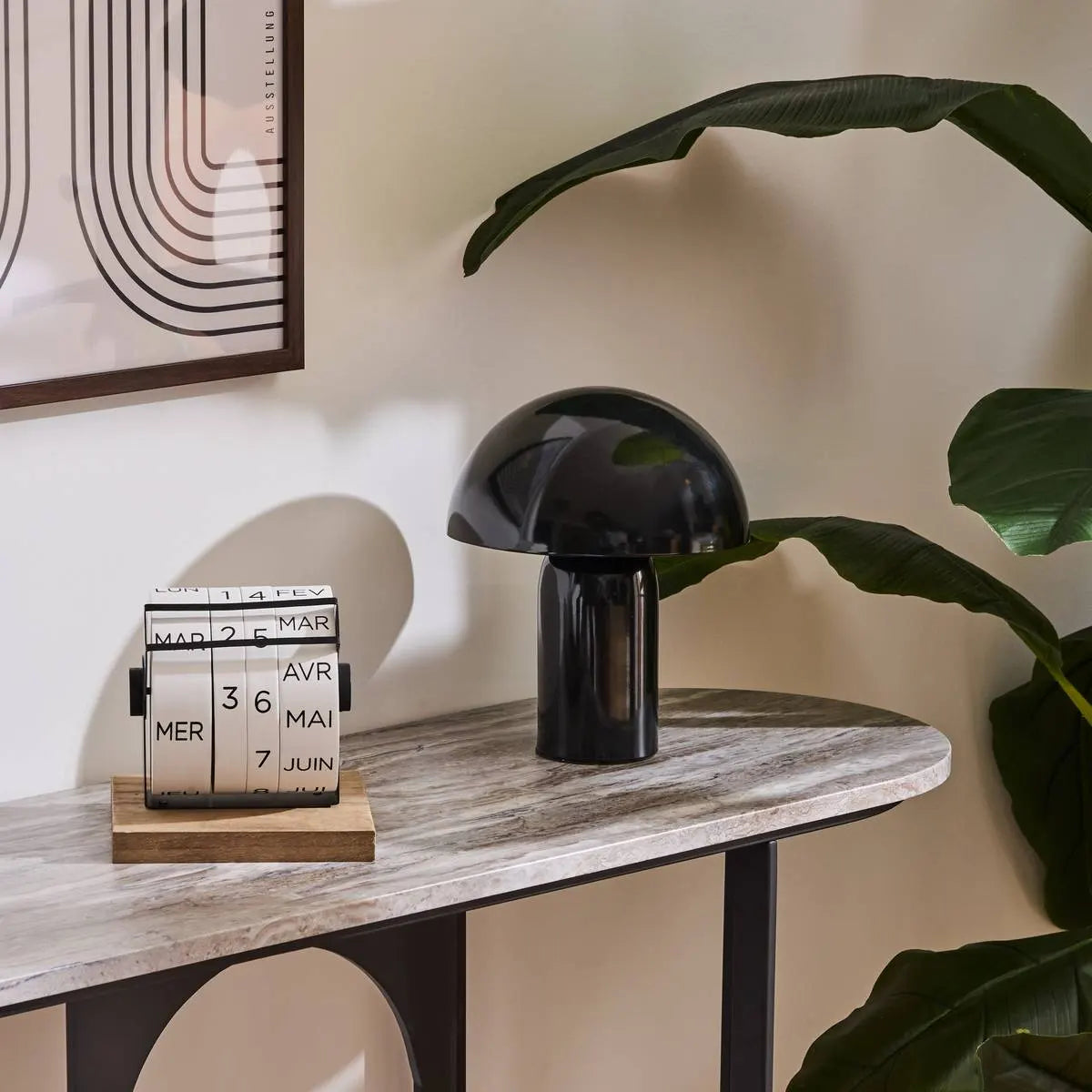 Елегантна настолна лампа с характерен гъбовиден силует и изчистена, модерна визия. Комбинира здравина на металната конструкция с мека, дифузна светлина, която създава уютна атмосфера и подчертава интериора без да натоварва пространството.