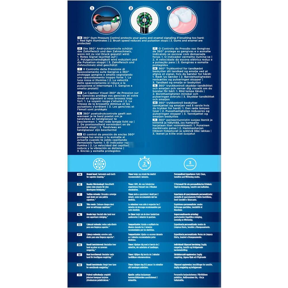 Oral-B Pro 3 3000 Sensitive Clean предлага ефективно премахване на бактериална плака с 9900 въртеливи и 45 000 пулсиращи движения в минута. Четката комбинира различни дължини на влакната и бързо движение за дълбоко почистване, като същевременно е щадяща към венците благодарение на вградения сензор за натиск.