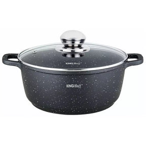Висококачествена мраморна тенджера Ø16cm / 1.3L със стъклен капак. Изработен от лят алуминий с мраморно незалепващо покритие . Продуктът с издръжлив, незалепващ мраморен слой позволява здравословно готвене без мазнини и лесно почистване и най-вече предпазва храната от изгаряне. Използваният материал запазва и провежда топлината перфектно.