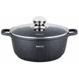 Висококачествена мраморна тенджера Ø20cm / 2.3L със стъклен капак. Изработен от лят алуминий с мраморно незалепващо покритие . Продуктът с издръжлив, незалепващ мраморен слой позволява здравословно готвене без мазнини и лесно почистване и най-вече предпазва храната от изгаряне. Използваният материал запазва и провежда топлината перфектно.