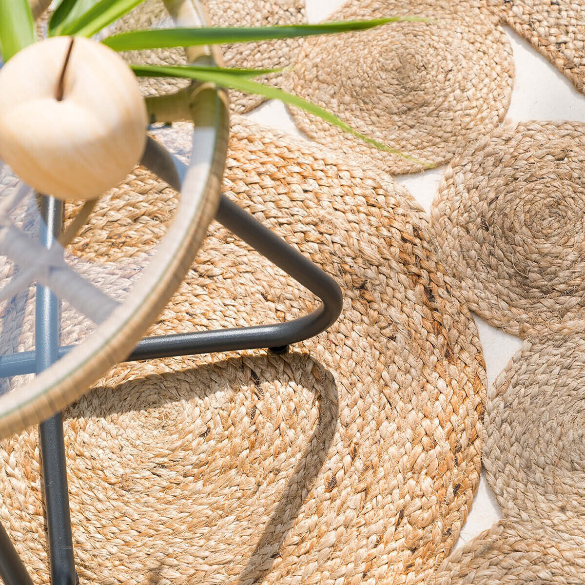 Кръглият килим от естествена юта впечатлява с ажурен дизайн, съставен от малки кръгове, напомнящи слънчеви лъчи. Естествената текстура внася топлина и уют, като същевременно създава екзотичен акцент в интериора. Подходящ избор за спалня, детска стая или дори офис, където ще добави нотка комфорт и хармония. Идеално се комбинира с ратанови осветителни тела и декоративни пана за завършена визия.