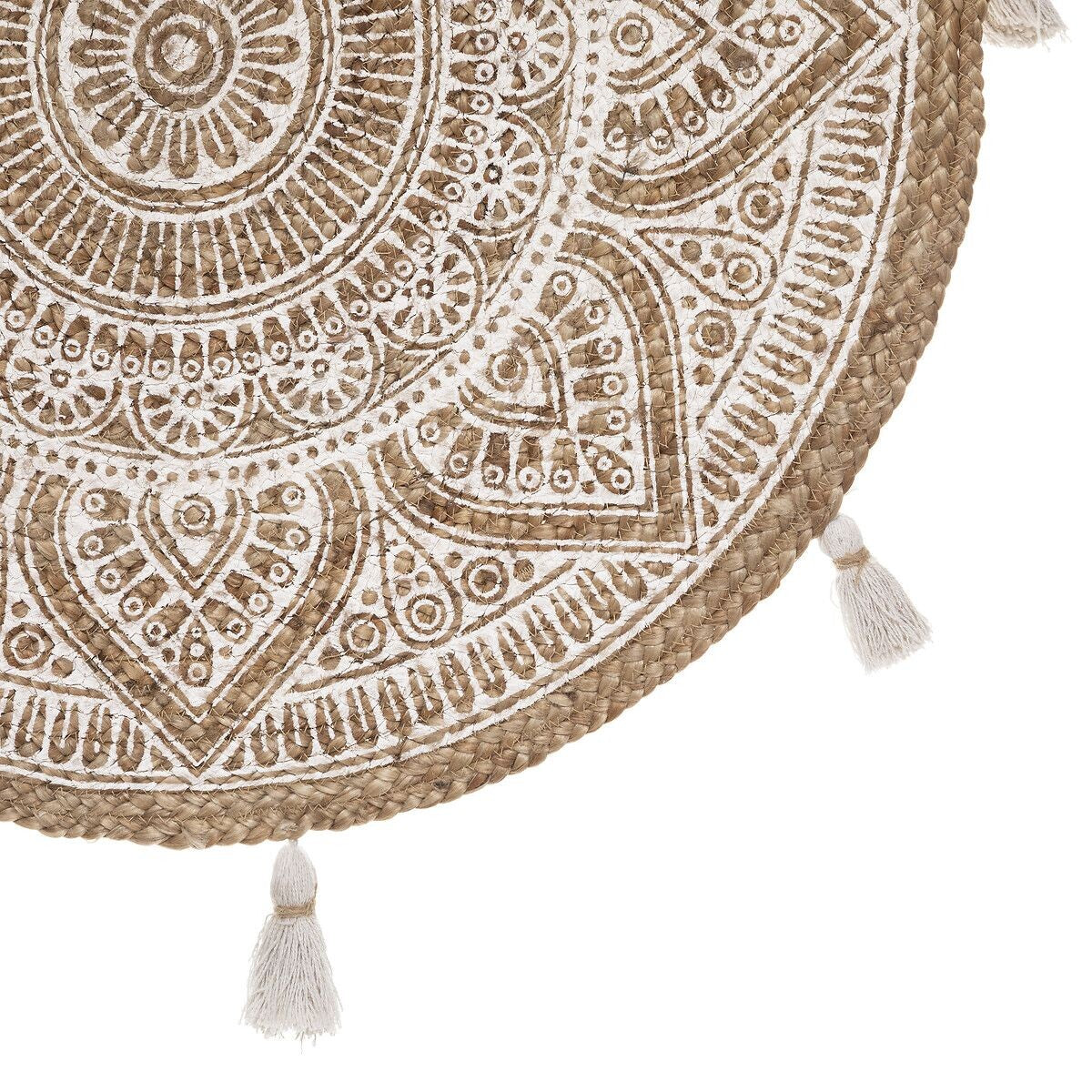 Кръглият килим от юта съчетава естествена визия с декоративен акцент в бяло. Игривите помпони по края добавят чар и уют, докато натуралната текстура придава топлина на интериора. Компактният размер го прави подходящ за спалня, детска стая или кът за почивка, където ще внесе свежест и хармония.