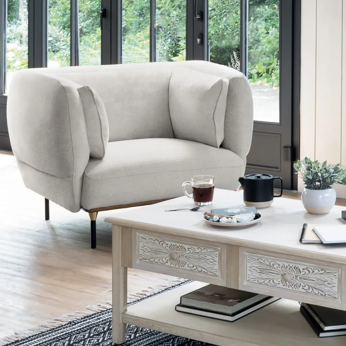 Кресло Isée с размери 113 x 97 x 80 см и тегло 32,5 кг, изработено от комбинация полиуретанова пяна, бор и стомана. Седалката е с височина 47 см, което осигурява удобна и стабилна позиция. Меката тапицерия в светлосив цвят и плътното пълнещо от полиуретанова пяна гарантират максимален комфорт, докато здравата дървена и метална конструкция осигуряват издръжливост. Креслото е идеален избор за просторни всекидневни или уютни зони за релакс, където съчетава модерна визия и практична функционалност.