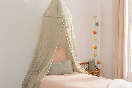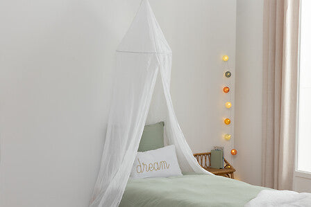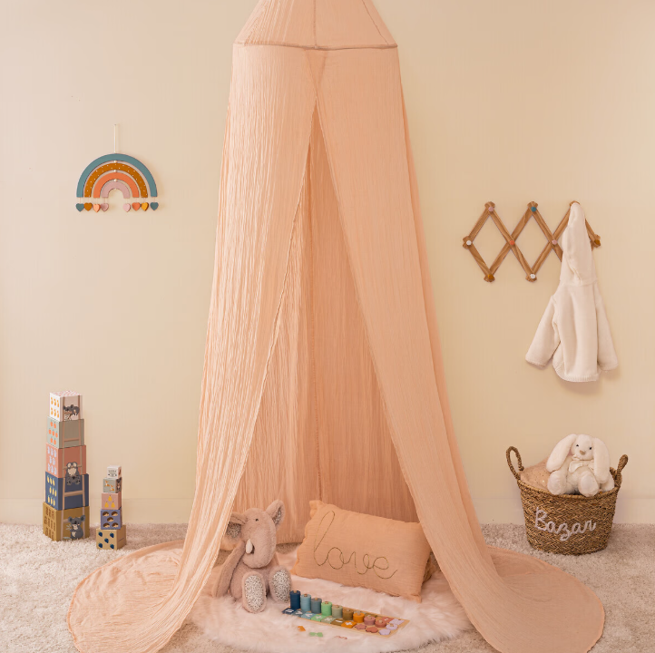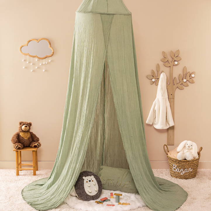 Изработен от 100% памук с Oeko-Tex сертификат, този детски балдахин е стилен и уютен декоративен акцент за стаята. С голяма височина и цилиндрична структура, той се фиксира лесно към тавана и пада елегантно от двете страни на леглото, обгръщайки детето в мекота и комфорт. Подходящ за всяка детска стая, той създава приказна атмосфера, за която мечтае всяко дете.
