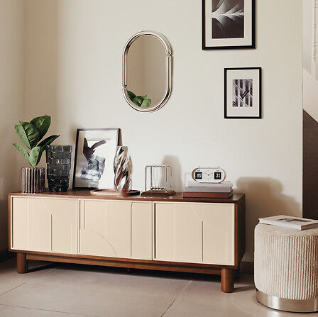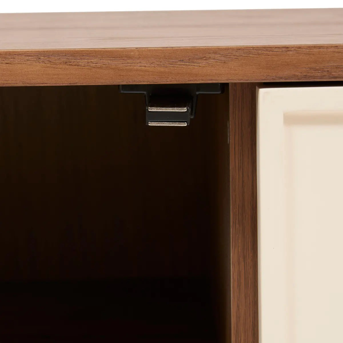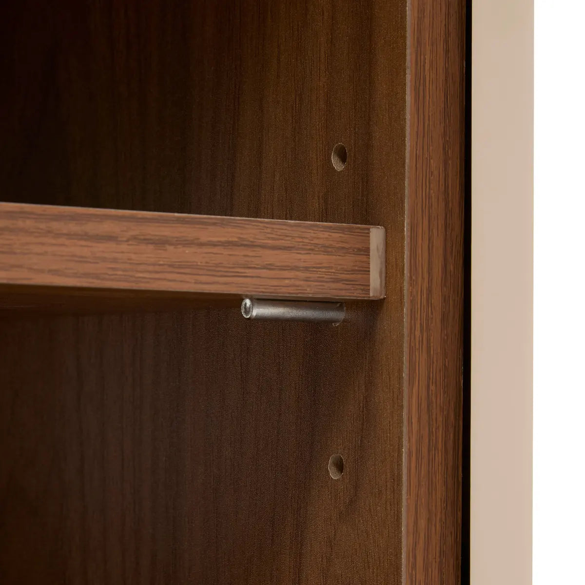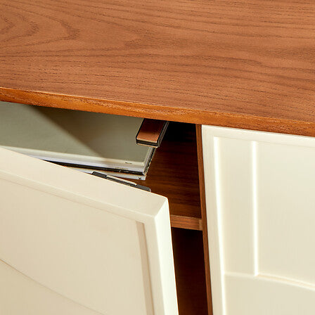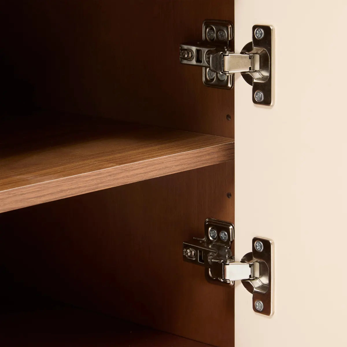 Шкафът предлага отлично организирано пространство – 4 отделения с врати и регулируеми рафтове, 1 чекмедже и 2 отвора за кабели за поддържане на подреден вид. Оборудван е с push-to-open система, плавно затварящи се панти и предпазни подложки за стабилност и защита на пода.