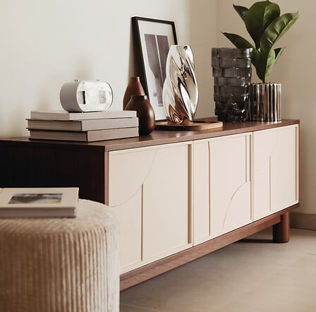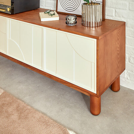 Елегантен ТВ шкаф Atmosphera с изчистен модерен дизайн и релефни геометрични фасади. Изработен е от MDF с външно покритие от ясен с орехов ефект и вътрешна структура от меламиново покритие в същия стил. Матовата повърхност и акрилният лак осигуряват устойчивост и издръжливост.