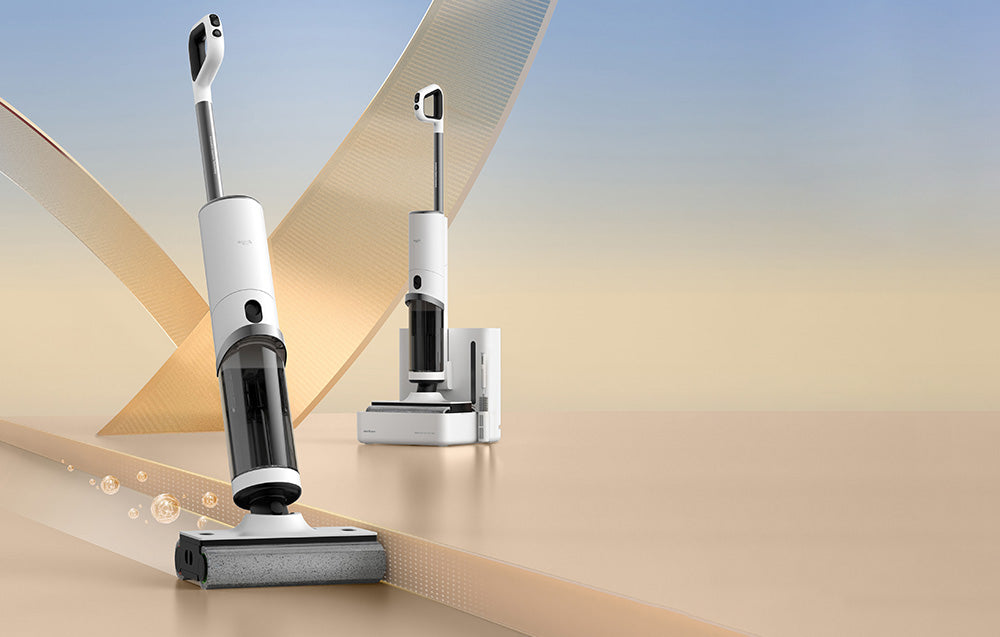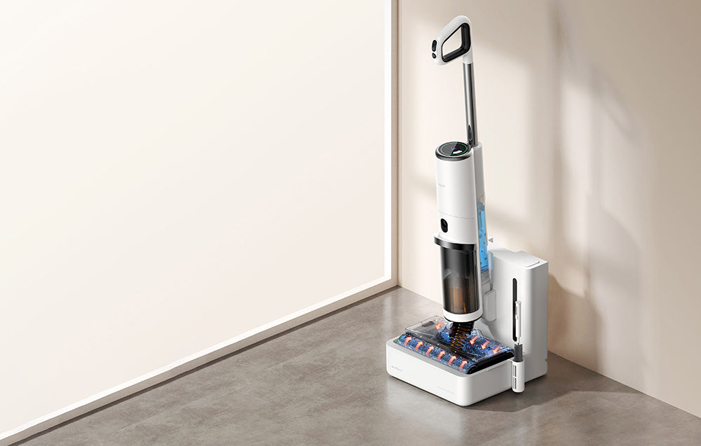 Безжичната прахосмукачка Deerma DEM-VX910W ви позволява да почиствате и миете подовете си едновременно, благодарение на наличието на два резервоара (за чиста и мръсна вода) и с мощност на засмукване до 16,000 Pa. Устройството включва специална станция, която автоматично почиства четката на машината и напълва резервоара ѝ с вода. Освен това прахосмукачката има вграден LED дисплей и сензор за прах, както и време на работа до 45 минути. Налични са и гласови команди. Четката на прахосмукачката е оборудвана с два ролера за по-ефективно почистване.