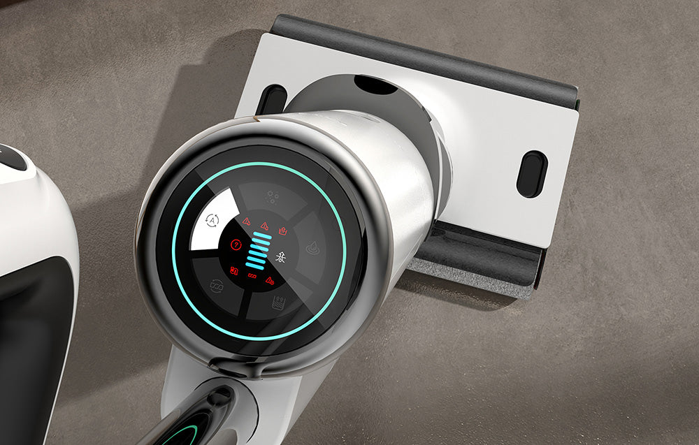 Интелигентни решения: Прахосмукачката има вграден голям дисплей, който предоставя ключова информация за работата ѝ. Устройството поддържа гласови команди, които ви напомнят, например, когато трябва да напълните резервоара с вода. Освен това, продуктът е оборудван със сензор за прах, който автоматично засича нивото на замърсяване в околната среда и съответно регулира мощността на засмукване. Информацията за концентрацията на прах също се показва на дисплея.