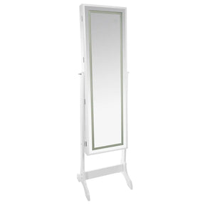 Шкафът за бижута Bettany с LED огледало в бяло съчетава модерна визия и практична подредба. Висок 156 см, той предлага удобно място за съхранение на всички бижута, като разполага с 40 слота за пръстени и 40 слота за обеци. Малките куки и държачи позволяват да подредите колиета и медальони без опасност от заплитане. Свободностоящото огледало е удобно за цялостен преглед на облеклото, а LED гирляндът по ръба придава съвременен акцент. Размерите са 47,5 × 37 × 148,5 см, огледалото е 116 × 33 × 0,3 см, а теглото е 11,8 кг. Това е стилно и функционално решение за подреден дом