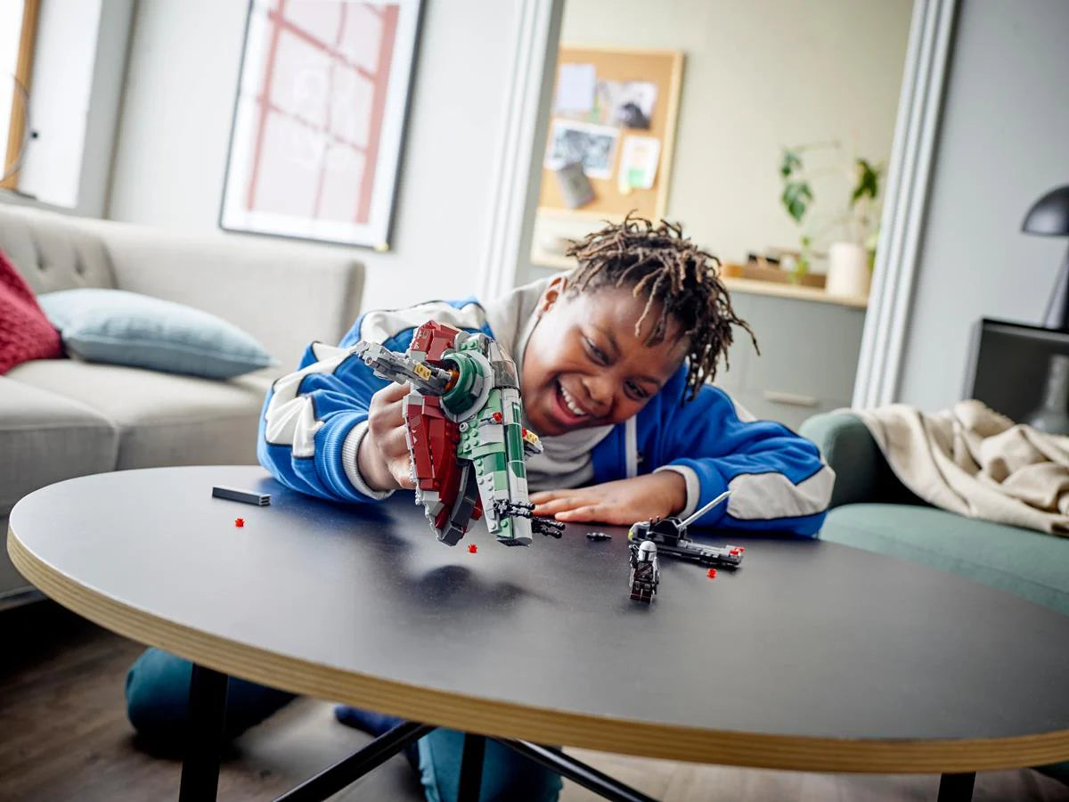 Постройте знаковия кораб на Boba Fett и играйте вълнуващи мисии с The Mandalorian! Скочете в пилотската кабина и започнете мисия за лов на глави. Стреляйте с оръдията, целете враговете с въртящите се двойни бластерни оръдия и ги замразете в карбонит. Приземете се в Tython и използвайте транспортьора, за да преместите кораба (или го покажете в изправена позиция за летене).